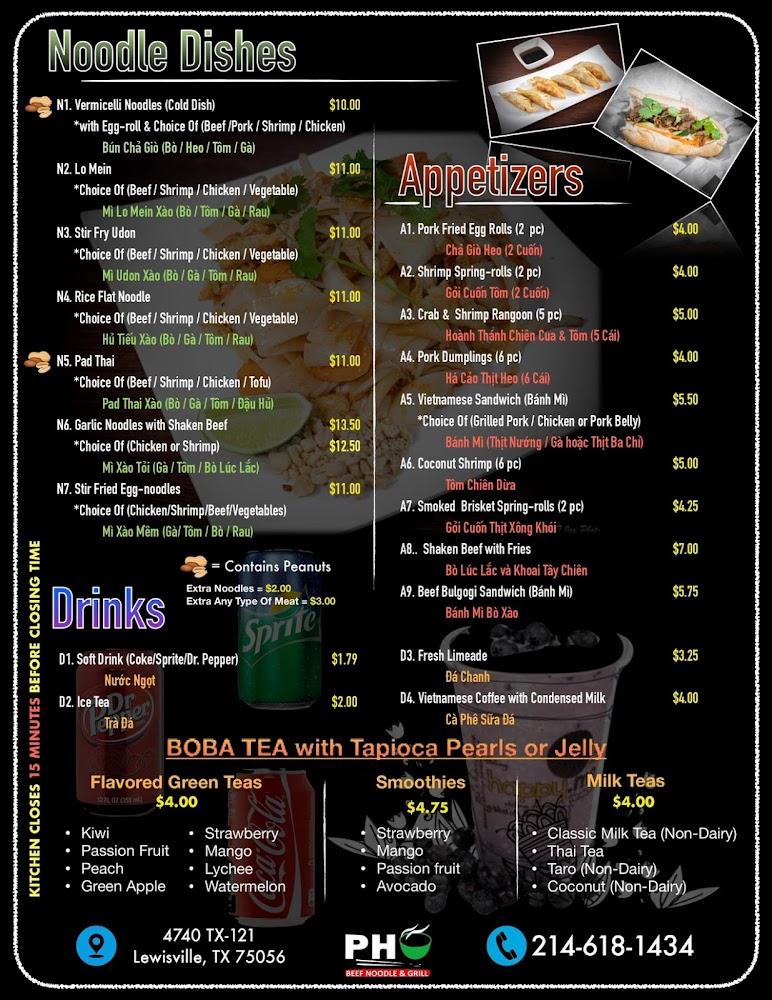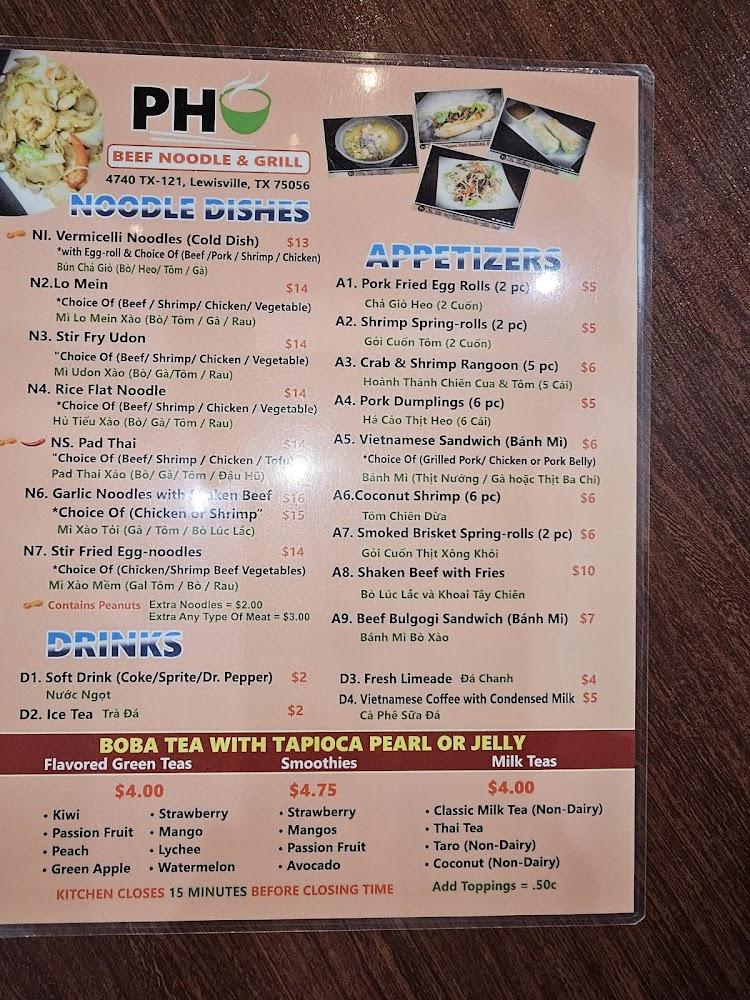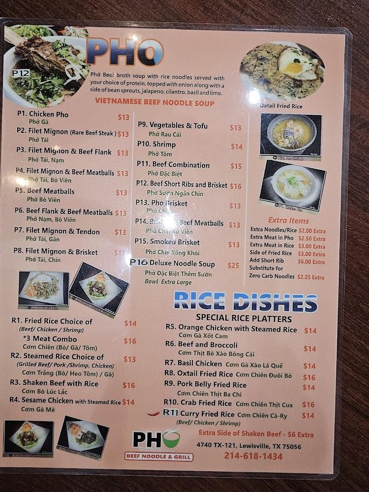 Welcome to Pho Beef Noodle & Grill, your ultimate destination for authentic Vietnamese cuisine in Lewisville, TX. Conveniently located at 4740 State Hwy 121, we specialize in deliciously crafted pho and traditional dishes that cater to every palate. Whether you're looking to dine in our cozy atmosphere, grab a quick bite, or enjoy our takeout and delivery services, we have you covered. With a focus on fresh ingredients and healthy options, our menu ranges from hearty meals to small shareable plates. Enjoy a relaxed dining experience with accessible amenities and a friendly staff ready to serve you. Join us for lunch or dinner today!